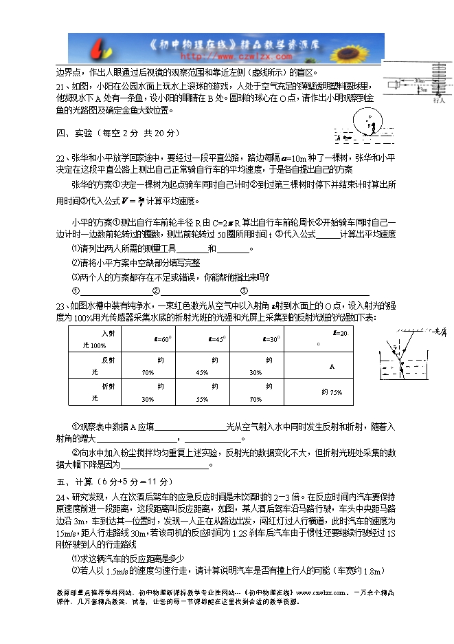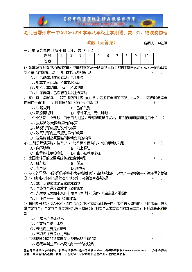 湖北省鄂州市一中2013-2014学年八年级上学期语、数、外、物联赛物理试题(无答案)