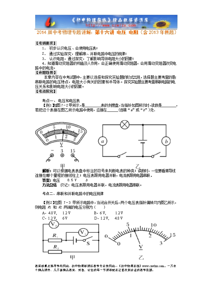 2014届中考物理专题讲解:第十六讲 电压 电阻(含2013年新题)