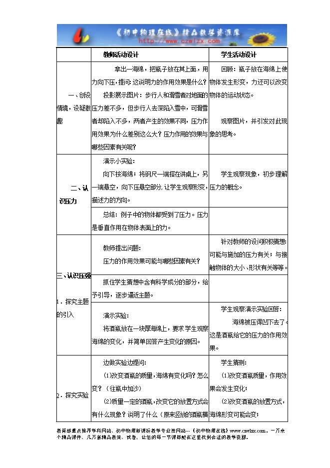 初中学生抽象思维能力不强,如何通过概括实验结论得出压强概念是本节的难点。