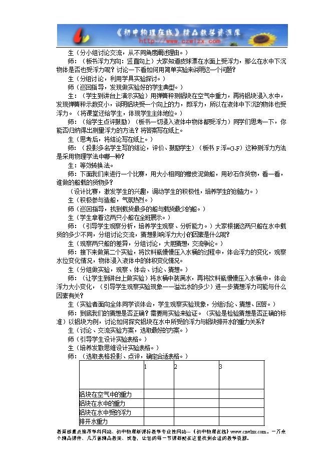 教具和媒体 皮球、铝块、弹簧秤、溢水杯、小筒、橡皮泥、砂石、饮料桶、水桶