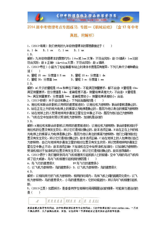 2014届中考物理考点专题练习:专题一《机械运动》(含13年中考真题,附解析)