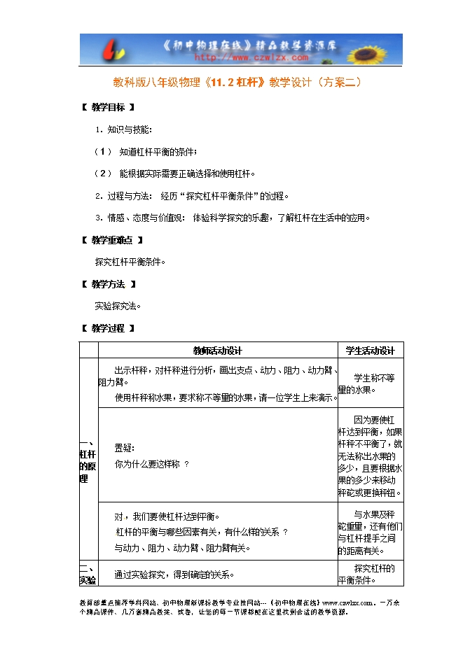 2.过程与方法: 经历“探究杠杆平衡条件”的过程。