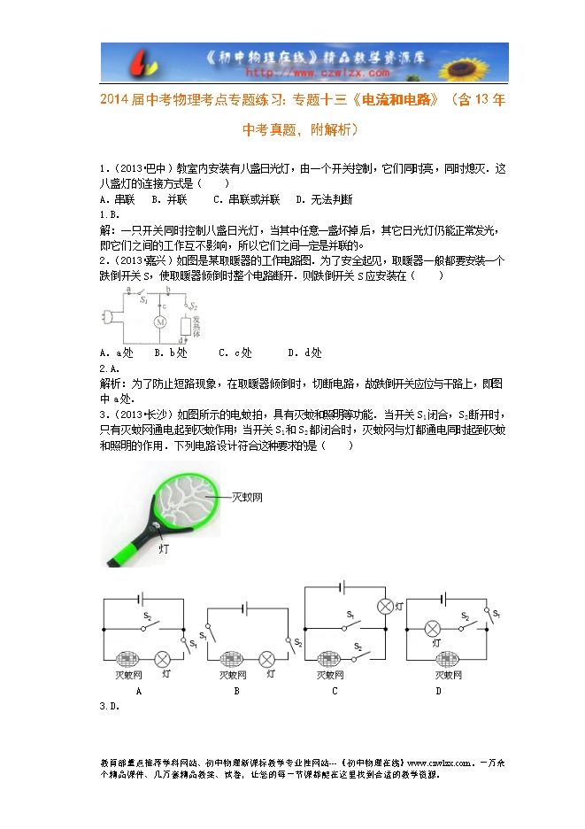 2014届中考物理考点专题练习:专题十三《电流和电路》(含13年中考真题,附解析)