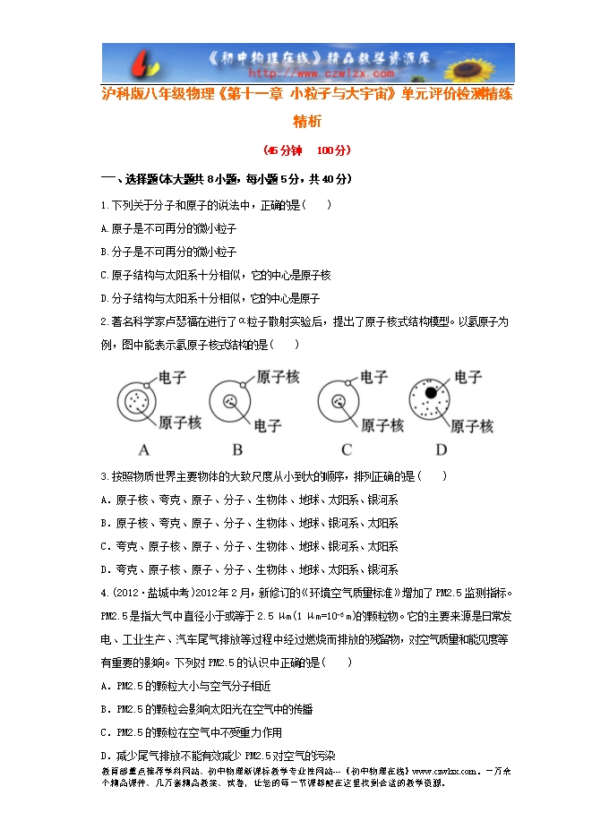 沪科版八年级物理《第十一章 小粒子与大宇宙》单元评价检测精练精析