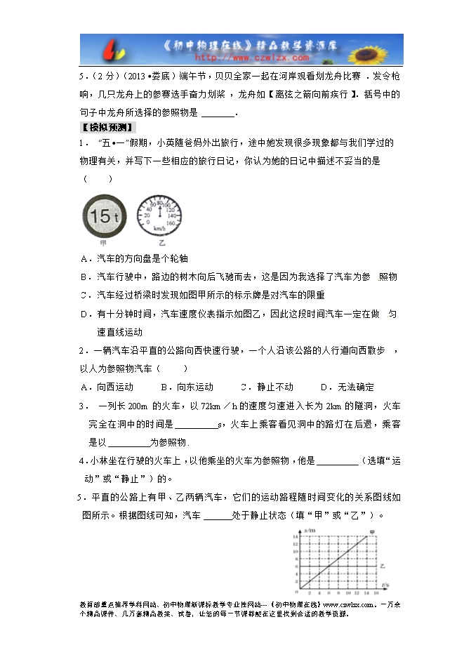 从中考命题看, 判断物体运动情况、参照物的选取、运动的相对性、速度概念的理解、速度单位换算、匀速 直线运动的理解和平均速度的计算常以填空、选择题型出现.平均速度的测量可能会以填空 或实验题型出现.在学习过程中要加强培养学生对运动过程的分析能力和建立运动图景来解 决问题的能力.
