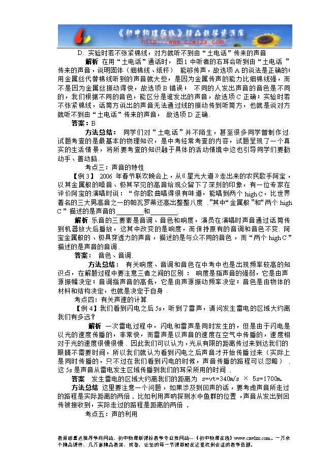 近年来对声现象的考查主要集中在声音的产生和传播、怎样防治噪声、超声波(次声波) 的应用、乐音的特征等内容上,其中噪声污染、超声波及次声波是新课标考试的热点,值得关注.