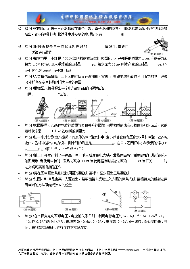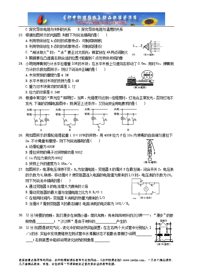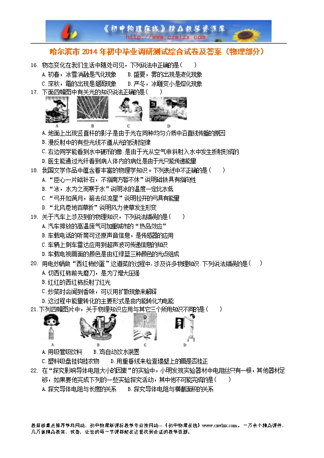 哈尔滨市2014年初中毕业调研测试综合试卷及答案(物理部分)