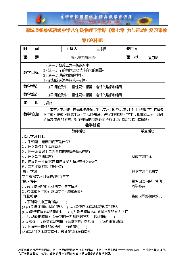 郯城县杨集镇初级中学八年级物理下学期《第七章 力与运动》复习课教案(沪科版)