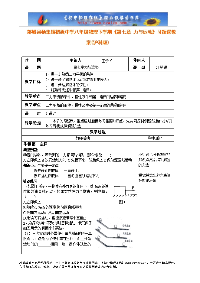 郯城县杨集镇初级中学八年级物理下学期《第七章 力与运动》习题课教案(沪科版)