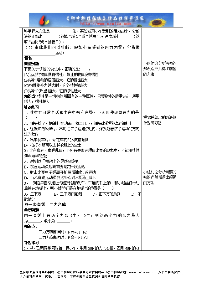 教学重点 二力平衡的条件、惯性及牛顿第一定律的理解和运用