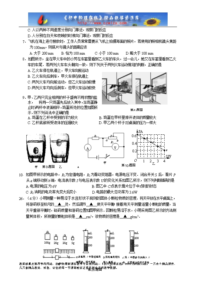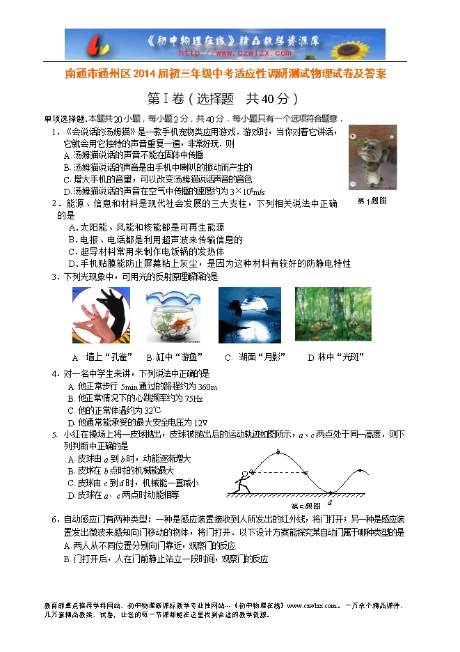 南通市通州区2014届初三年级中考适应性调研测试物理试卷及答案