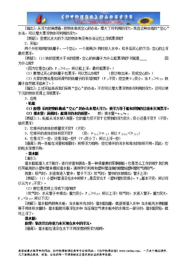 ●教学仪器:烧杯、水、体积相同的蜡块和铁块、两个铁罐子、沙子、潜水艇模型、热气球模型。 ●教学流程: