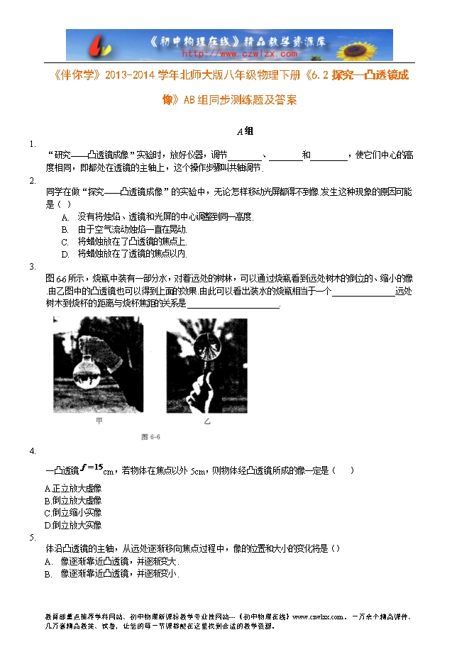 《伴你学》2013-2014学年北师大版八年级物理下册《6.2探究—凸透镜成像》AB组同步测练题及答案