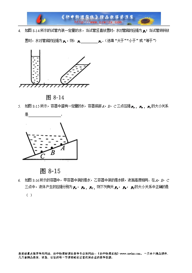 4. 如图8-14所示的试管内装一定量的水,当试管竖直放置时,水对管底的压强为 ;当试管倾斜放置时,水对管底的压强为 ,则: __________ .(选填“大于”“小于”或“等于”)