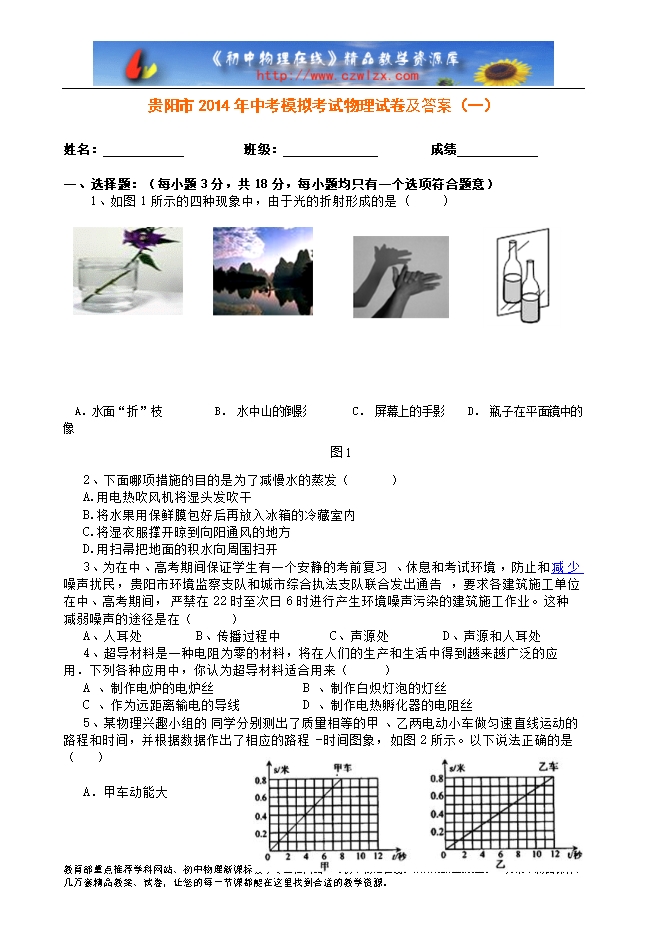 贵阳市2014年中考模拟考试物理试卷及答案(一)