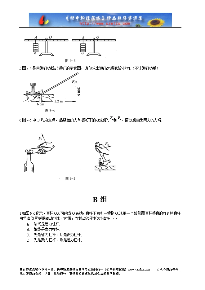 6.图9-5中O均为支点,起瓶盖的力和拔钉子的力分别为 和 ,请分别画出两力的力臂.