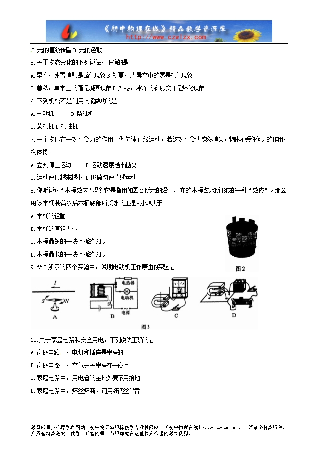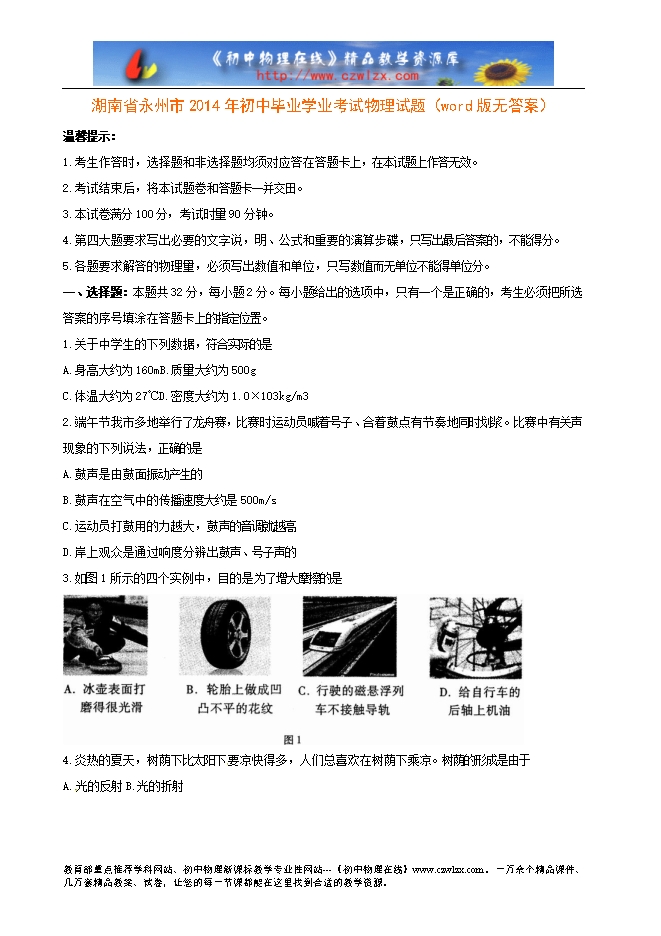 湖南省永州市2014年初中毕业学业考试物理试题(word版无答案)