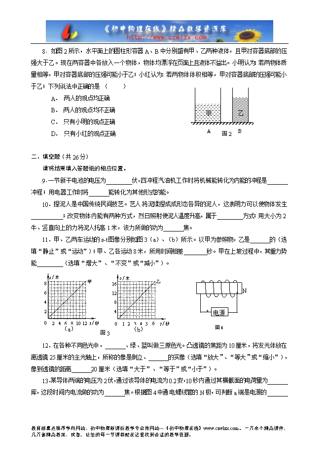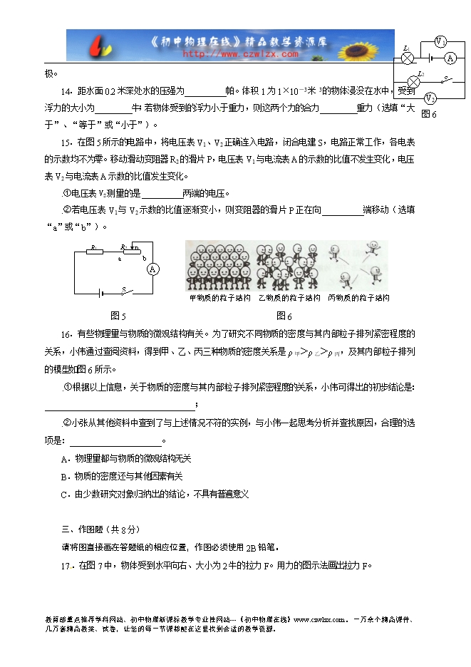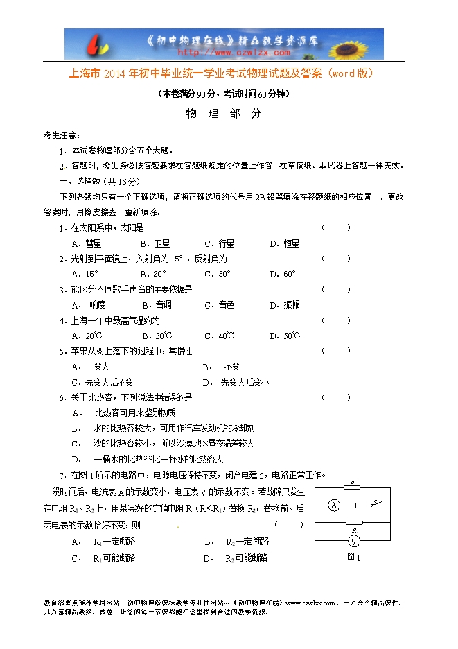 上海市2014年初中毕业统一学业考试物理试题及答案(word版)