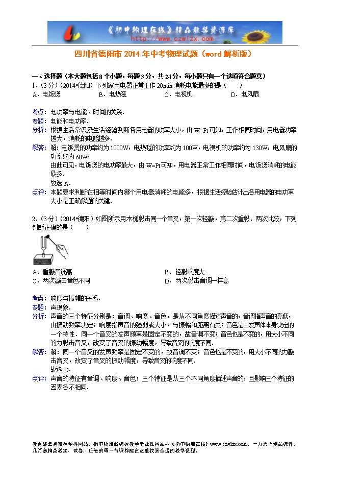 1.(3分)(2014•德阳)下列家用电器正常工作20min消耗电能最多的是( )