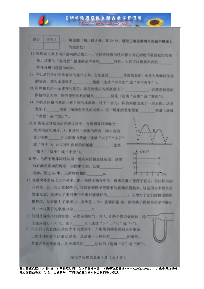 黑龙江省绥化市2014年中考物理试题(扫描版,无答案)