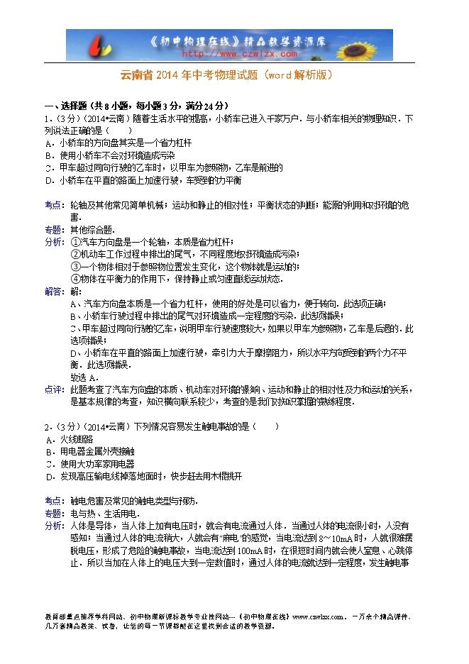 【内容简介】一、选择题(共8小题,每小题3分,满分24分) 1.(3分)(2014•云南)随着生活水平的提高,小轿车已进入千家万户.与小轿车相关的物理知识.下列说法正确的是(  )   A. 小轿车的方向盘其实是一个省力杠杆   B. 使用小轿车不会对环境造成污染   C. 甲车超过同向行驶的乙车时,以甲车为参照物,乙车是前进的   D. 小轿车在平直的路面上加速行驶,车受到的力平衡 考点: 轮轴及其他常见简单机械;运动和静止的相对性;平衡状态的判断;能源的利用和对环境的危害. 专题: 其他综合题. 分析: ①汽车方向盘是一个轮轴,本质是省力杠杆; ②机动车工作过程中排出的尾气,不同程度地对环境造成污染; ③一个物体相对于参照物位置发生变化,这个物体就是运动的; ④物体在平衡力的作用下,保持静止或匀速直线运动状态. 解答: 解: A、汽车方向盘本质是一个省力杠杆,使用的好处是可以省力,便于转向.此选项正确; B、小轿车行驶过程中排出的尾气对环境造成一定程度的污染.此选项错误; C、甲车超过同向行驶的乙车,说明甲车行驶速度较大,如果以甲车为参照物,乙车是后退的.此选项错误; D、小轿车在平直的路面上加速行驶,牵引力大于摩擦阻力,所以水平方向受到的两个力不平衡.此选项错误. 故选A. 点评: 此题考查了汽车方向盘的本质、机动车对环境的影响、运动和静止的相对性及力和运动的关系,是基本规律的考查,知识横向联系较少,考查的是我们对知识掌握的熟练程度.   2.(3分)(2014•云南)下列情况容易发生触电事故的是(  )   A. 火线断路   B. 用电器金属外壳接触   C. 使用大功率家用电器   D. 发现高压输电线掉落地面时,快步赶去用木棍挑开 .........   下载word文档附件