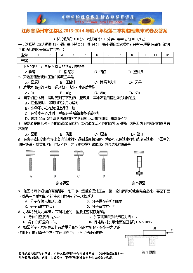 江苏省扬州市江都区2013-2014年度八年级第二学期物理期末试卷及答案