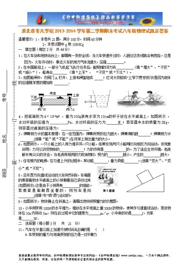 淮北市非凡学校2013-2014学年第二学期期末考试八年级物理试题及答案