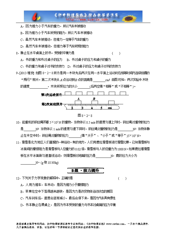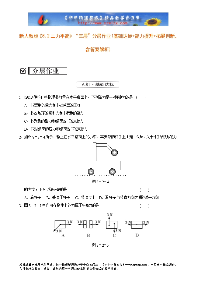 【内容简介】1.[2013?遵义] 将物理书放置在水平桌面上,下列各力是一对平衡力的是 (  ) A.书受到的重力和书对桌面的压力 B.书对地球的吸引力和书受到的重力 C.书受到的重力和桌面对书的支持力 D.书对桌面的压力和桌面对书的支持力 2.如图8-2-4所示,静止在水平路面上的小车,其支架的杆子上固定一铁球,关于杆子给铁球的力 图8-2-4 的方向,下列说法正确的是 (  ) A.沿杆子 B.垂直于杆子 C.竖直向上 D.沿杆子与竖直方向之间的某一方向 3.图8-2-5中作用在物体上的力属于平衡力的是 (  ) 图8-2-5 4.[2013?株洲] 下列运动过程中,处于平衡状态的物体是 (  ) A.在空中自由下落的苹果 B.竖直向上抛出的石子 C.沿光滑斜坡滚动的小球 D.在空中匀速直线下降的跳伞运动员 5.如图8-2-6所示,升降机以1 m/s的速度匀速上升时,升降机对人的支持力为500 N。下列说法正确的是 (  ) 图8-2-6 A.升降机静止在十楼时对人的支持力小于500 N B.升降机以1.5 m /s的速度匀速上升时对人的支持力大于500 N C. 升降机以2 m/s的速度匀速下降时对人的支持力等于500 N D.升降机以1 m /s的速度匀速下降时对人的支持力小于500 N 6.2010年温哥华冬奥会上,中国选手王濛一人获得三枚金牌,并打破世界纪录,如图8-2-7所示。下列论述错误的是 (  ) ........ ? ? ?