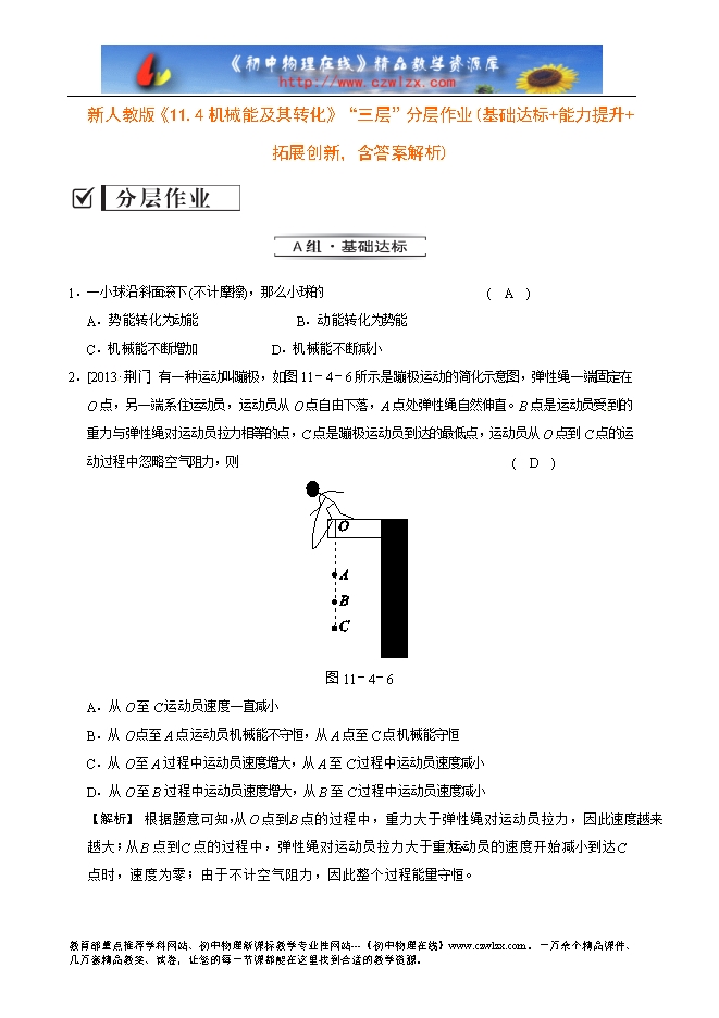 2.[2013 ?荆门] 有一种运动叫蹦极,如图11-4-6所示是蹦极运动的简化示意图,弹性绳一端固定在O点,另一端系住运动员,运动员从O点自由下落,A点处弹性绳自然伸直。B点是运动员受 到的重力与弹性绳对运动员拉力相等的点,C点是蹦极运动员到达的最低点,运动员从O点到C点的运动过程中忽略空气阻力,则 ( D )