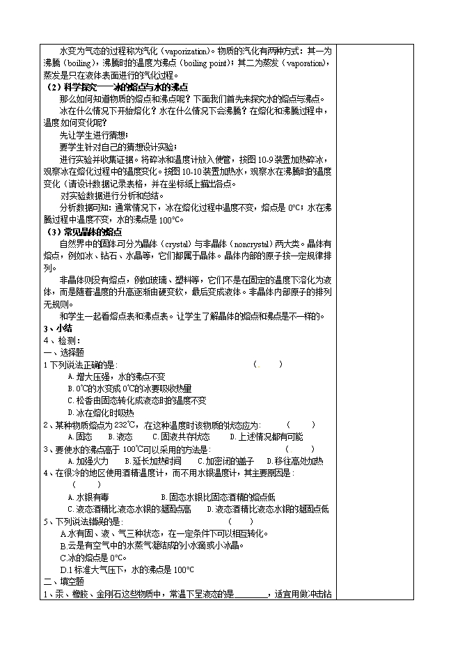 教学目标: 1、通过对水的熔点和沸点的科学探究,熟悉科学探究全过程的各个环节。