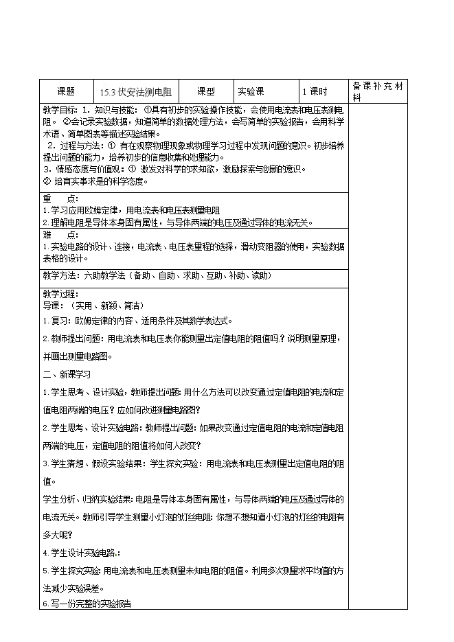 辛锐中学《15.3伏安法测电阻》六助教学法实施教案(新沪科版)