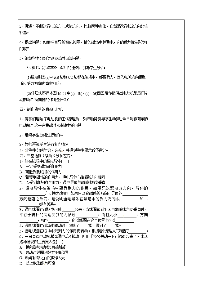 教学目标:①通过学生亲自实验探究,体验科学研究的基本方法,即提出问题,观察实验,收集证据,分析和论证等,知道电动机转动原理。
