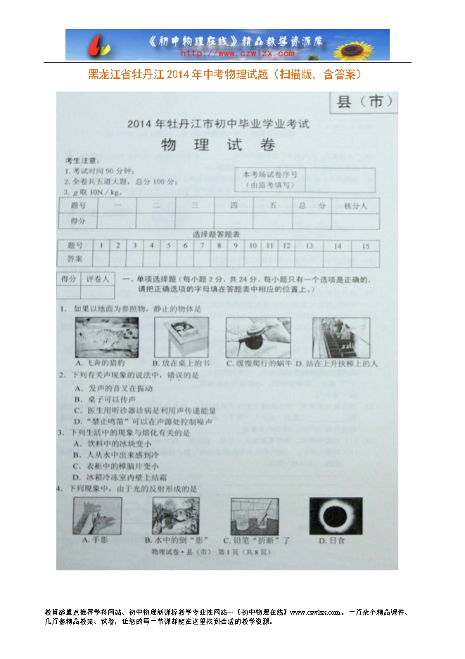 黑龙江省牡丹江市2014年中考物理试题(扫描版,含答案)