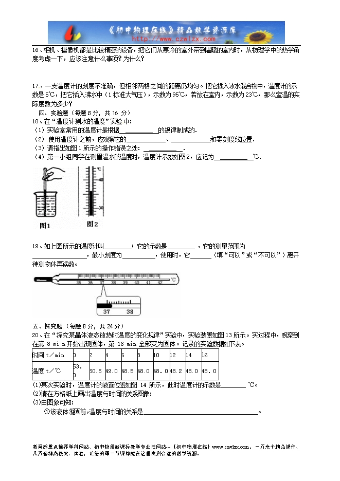 1、常用温度计是根据液体热胀冷缩的原理制成的,里面的液体有的用酒精,有的用水银.已知酒精和水银的熔点和沸点如表所示,北方漠河地区冬季最低温度可达一54℃,测此地冬季最低气温应选________温度计,测1标准大气压下沸水的温度应选________温度计.(选填“酒精”或“水银”)