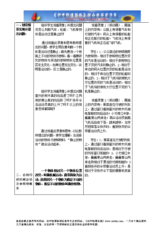 二、总结归纳机械运动及参照物概念 组织学生观看录像1并提出问题:你怎么判断汽车、轮船、飞机等物体是运 动还是静止的?