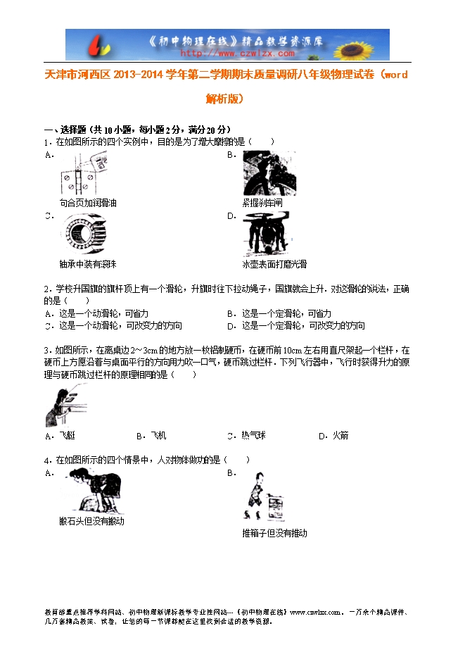 天津市河西区2013-2014学年第二学期期末质量调研八年级物理试卷(word解析版)