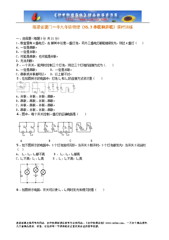 福建省厦门一中九年级物理《15.3串联和并联》课时训练