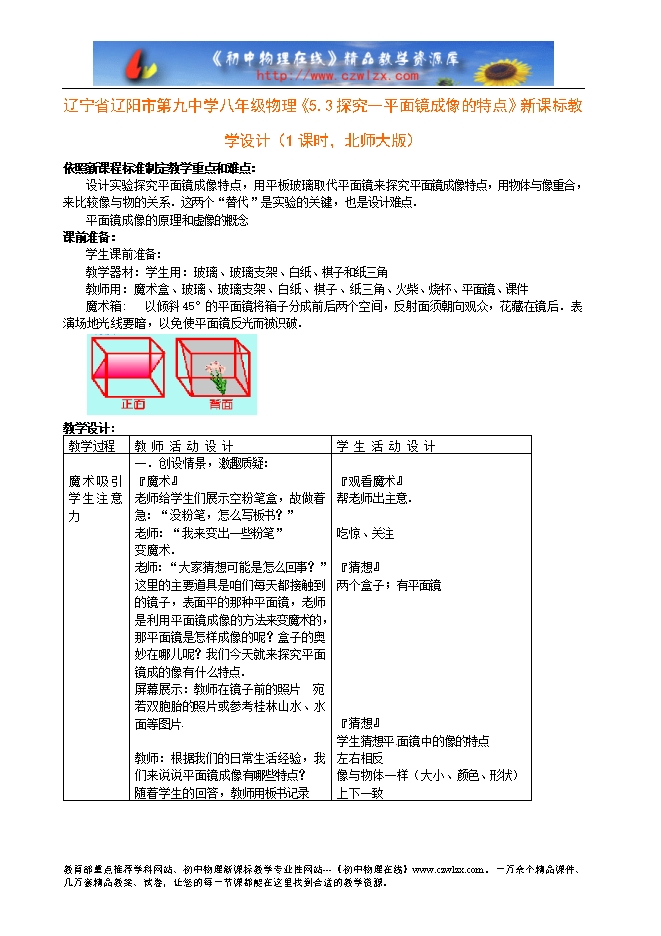 辽宁省辽阳市第九中学八年级物理《5.3探究--平面镜成像的特点》新课标教学设计(1课时,北师大版)