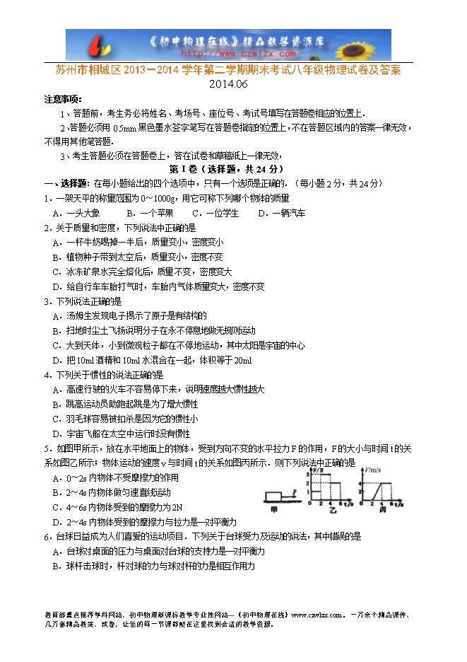 苏州市相城区2013-2014学年第二学期期末考试八年级物理试卷及答案