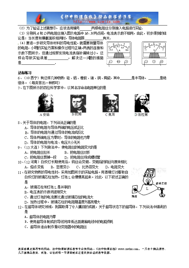 3、有三根相同材料制成的导体A、B、C,在相同的温度下,A比B长,粗细相同;C与B长度一样,C粗些.这三根导体的电阻由大到小的排列顺序为 。