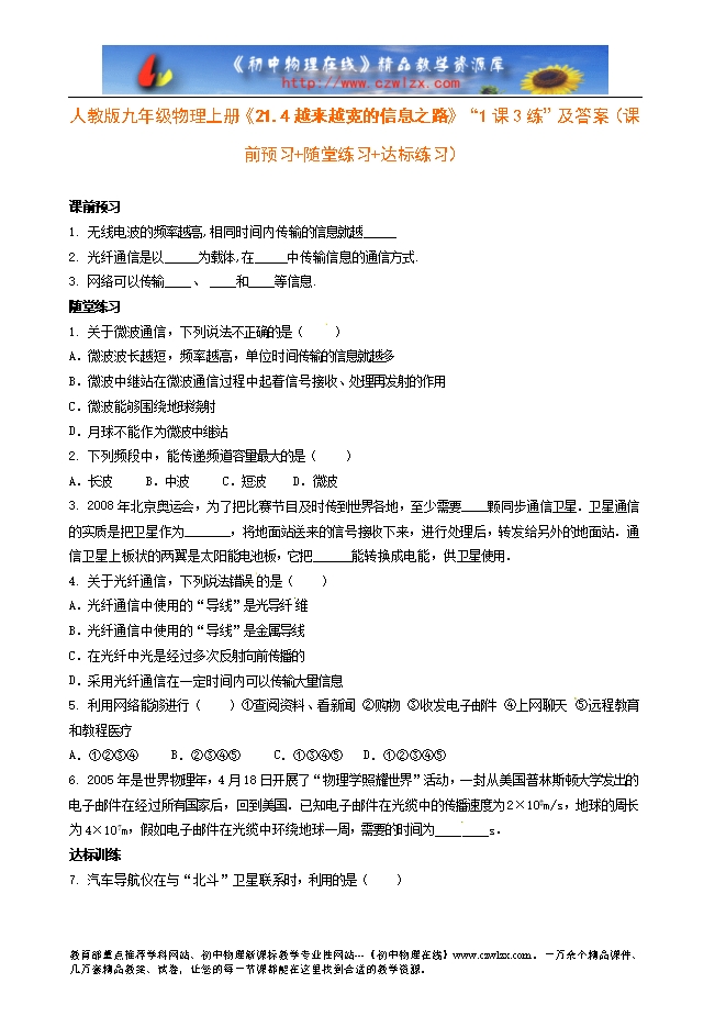 人教版九年级物理上册《21.4越来越宽的信息之路》“1课3练”及答案(课前预习+随堂练习+达标练习)