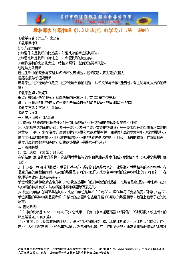 2.知道比热是物质的特性之一,会查物质的比热表。