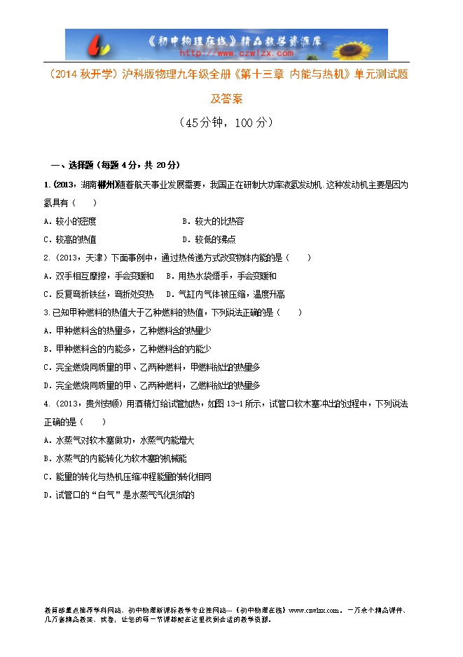 (2014秋开学)沪科版物理九年级全册《第十三章 内能与热机》单元测试题及答案