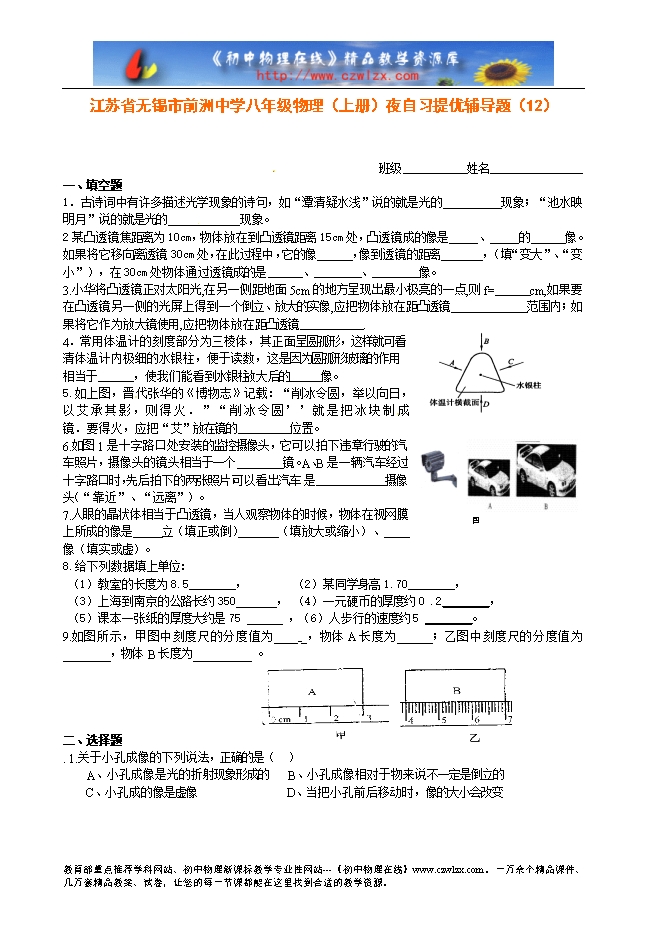 江苏省无锡市前洲中学八年级物理(上册)夜自习提优辅导题(12)
