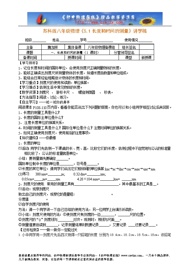 苏科版八年级物理《5.1长度和时间的测量》讲学稿