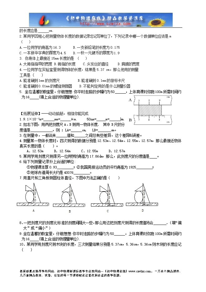 ⑴活动:同学们先估测一下课桌的长、宽、高,比较它们的长度,估测过程中不自觉地与公认的标准量相比较了,公认的标准量就是单位。