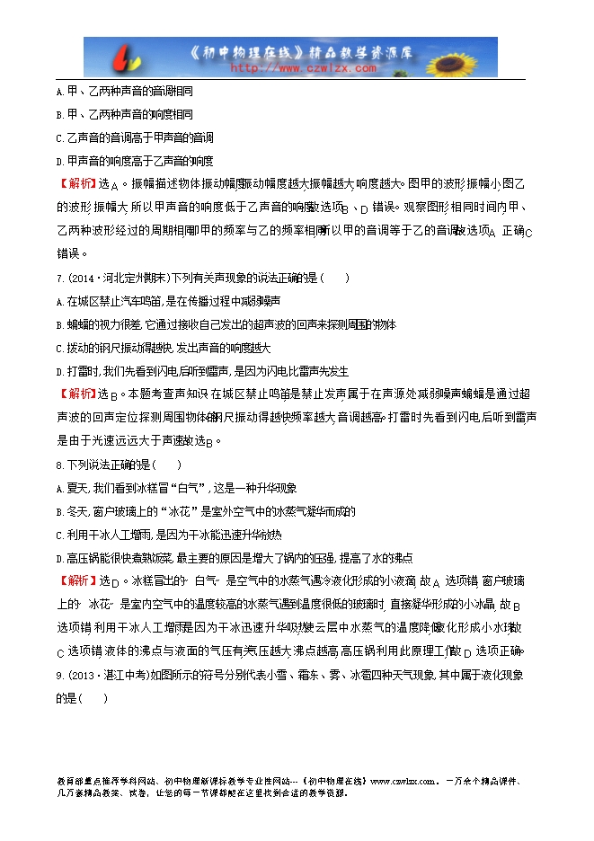 【解析】选D。由图知,在相同时间内,乙通过的路程大于甲通过的路程,故乙的速度大于甲的速度。A、B项甲、乙处于静止状态,C项甲的速度大于乙的速度,D项乙的速度大于甲的速度。故选D。