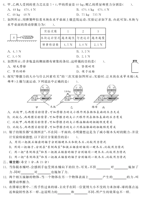 6.甲、乙两人受到的重力之比是5∶4,甲的质量是60kg,则乙的质量和重力分别是( ).