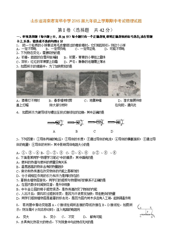 山东省济南市育华中学2015届九年级上学期期中考试物理试题及答案(沪科版)