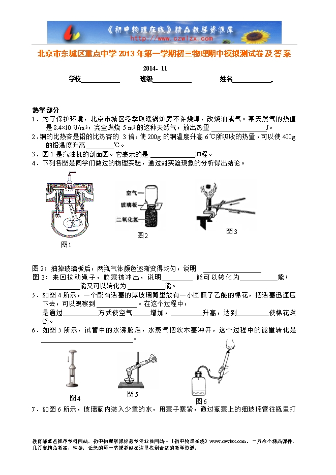 北京市东城区重点中学2013年第一学期初三物理期中模拟测试卷及答案